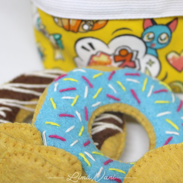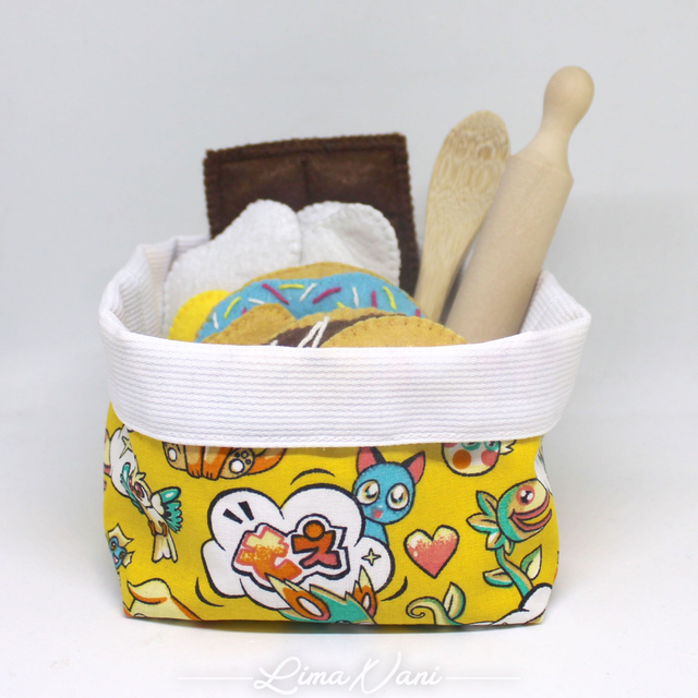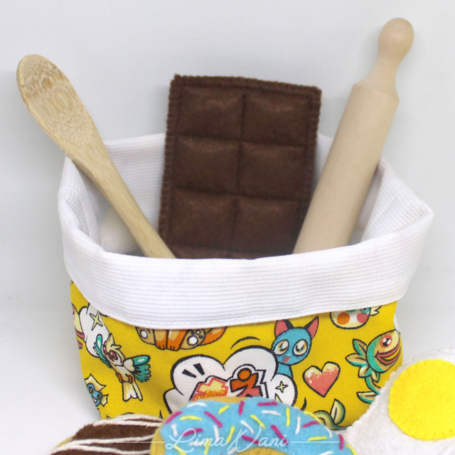 Le panier d'éveil MEA Pâtissier est un joli petit panier en coton rempli de petits objets en feutrine et bois.
